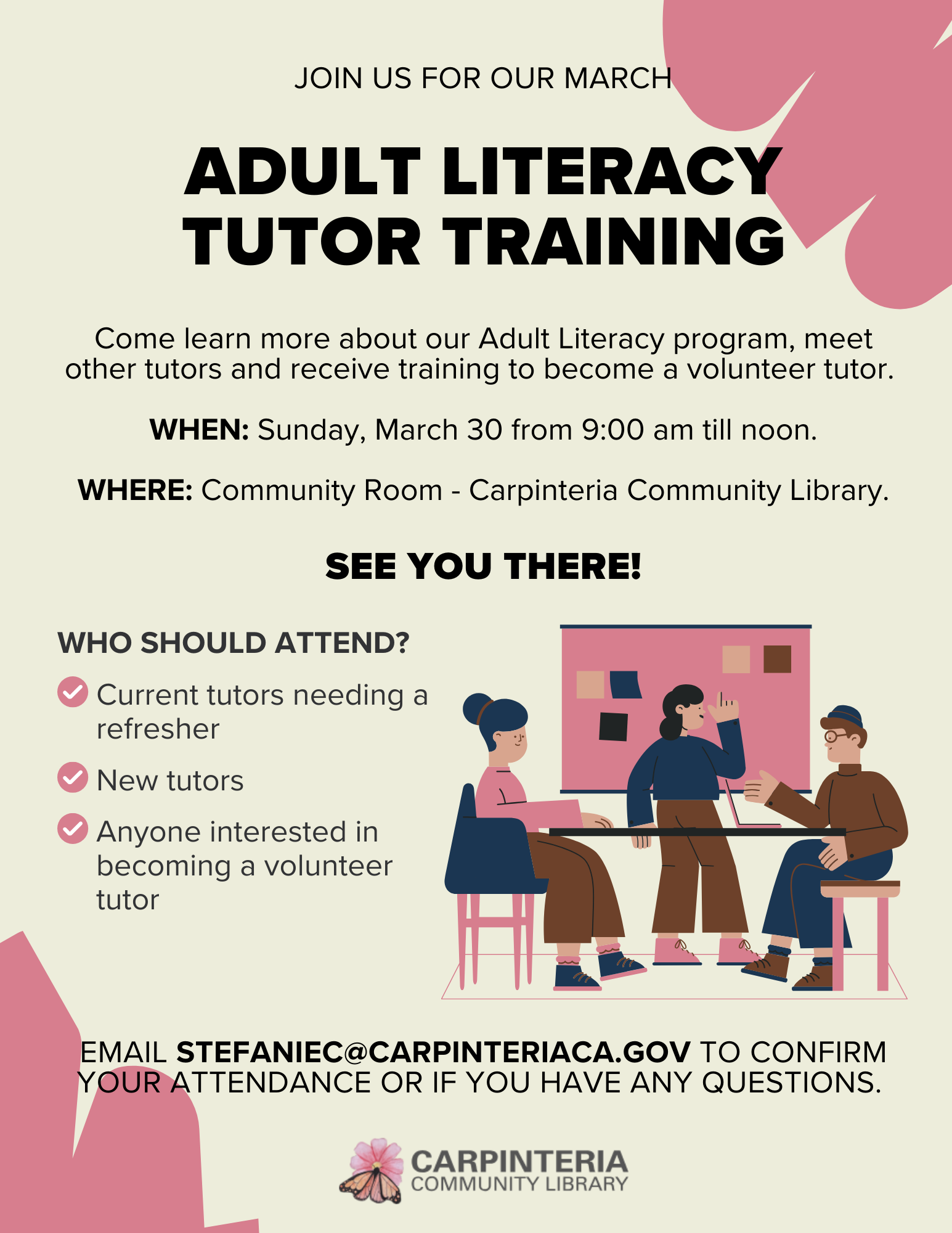 Come learn more about our Adult Literacy Program, meet other tutors and receive training to become a volunteer tutor.