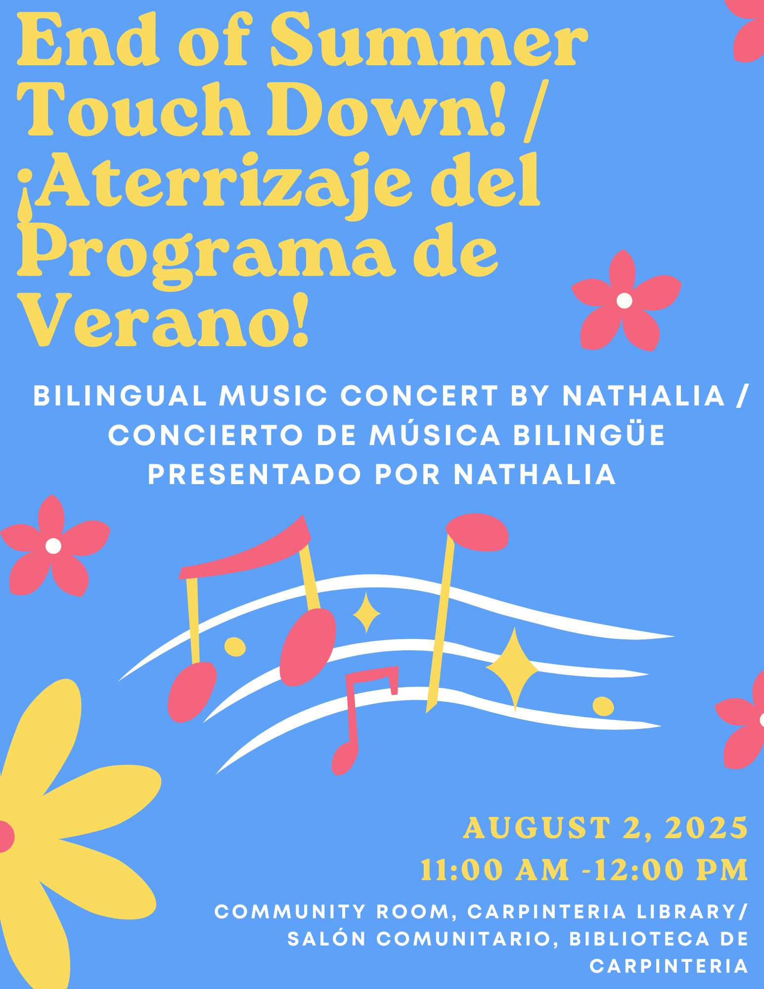 Celebrate the end of our Summer Reading Program with a fun, high-energy bilingual music concert by Nathalia! Perfect for families and kids of all ages. 🗓 Date: August 2🕚 Time: 11:00 AM – 12:00 PM📍 Location: Community Room, Carpinteria Community Library Celebra el final de nuestro Programa de Lectura de Verano con un divertido concierto […] |