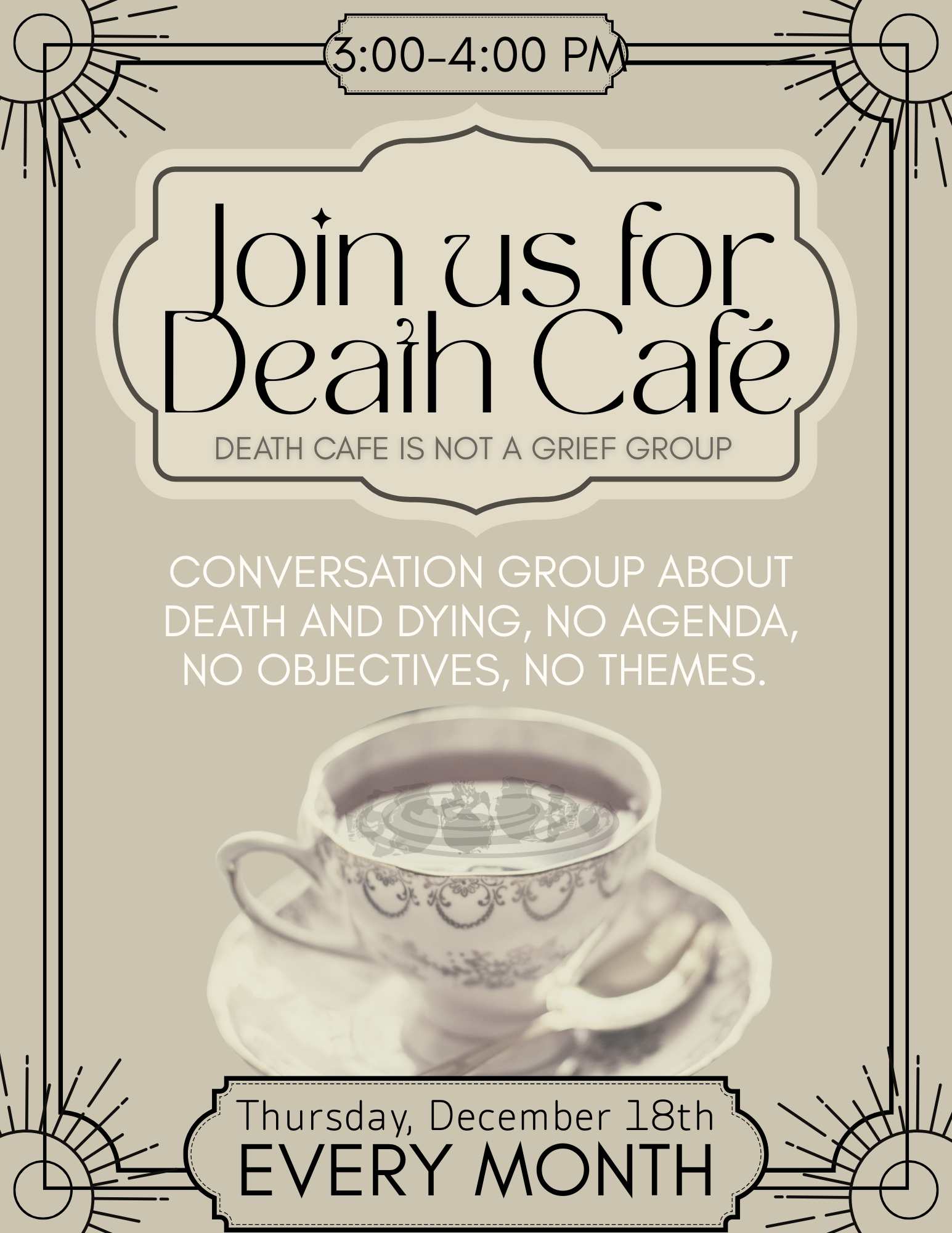 This conversation group is about death and dying. No agenda, no objectives, no themes. Death Cafe is not a grief group. IMPORTANT: our gathering this month will be THURSDAY, December 18 in the meeting room between the Vets Hall and the Library. Entrance to that space is on Walnut Avenue, through the iron gate. We […]